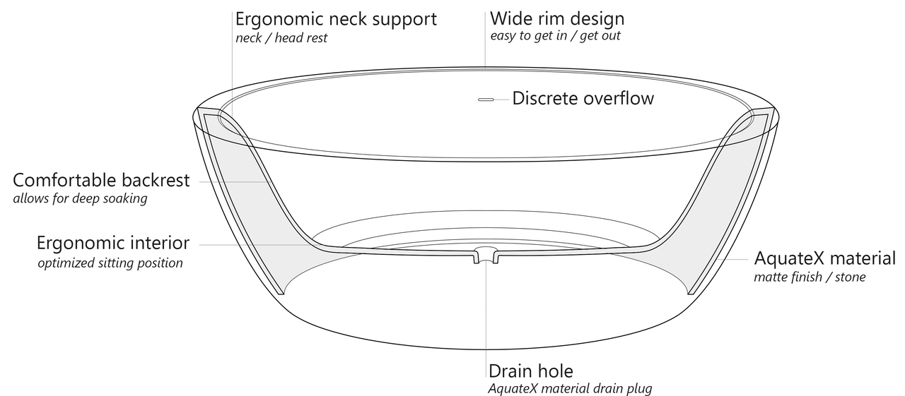 The natural, earthy forms of this Scandinavian-designed soaking tub creates an attractive and sculpted appeal in a contemporary or classically styled bathroom space. The deep and double-ended, freestanding design of this one-piece, solid AquateX™ model provides for excellent heat retention and lifelong durability.