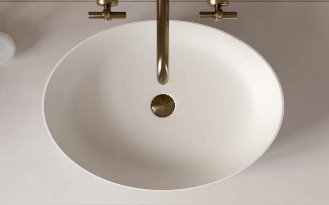 The Aurora Round basin is a low profile, circular vessel with a streamlined form. Its sister basin, the Oval is equally unembellished and simple in shape with a wider diameter.
