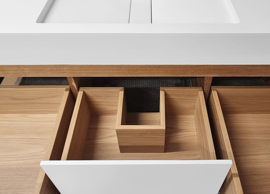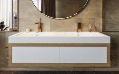 The Aquatica Millennium is an exclusive wall-mounted vanity collection, combining the best solid wood with award-winning white AquateX™ stone composite solid surface. Made by world-class master craftsmen, this ultra sleek built-in cabinet offers a simple sophisticated solution to bathroom space and storage issues.